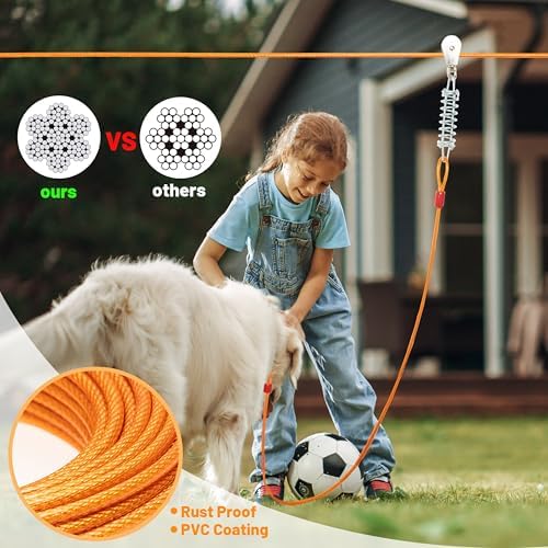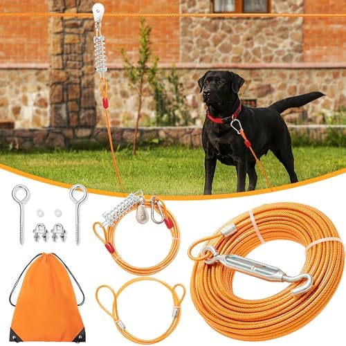 This 100 ft dog tie out cable provides your dog with a free range of outdoor activities, while also preventing your pet from accidentally getting lost while playing outdoors. Compared to a typical dog cable stake, using the trolley dog tie out cable can minimize the chances of your dog getting into an accident.